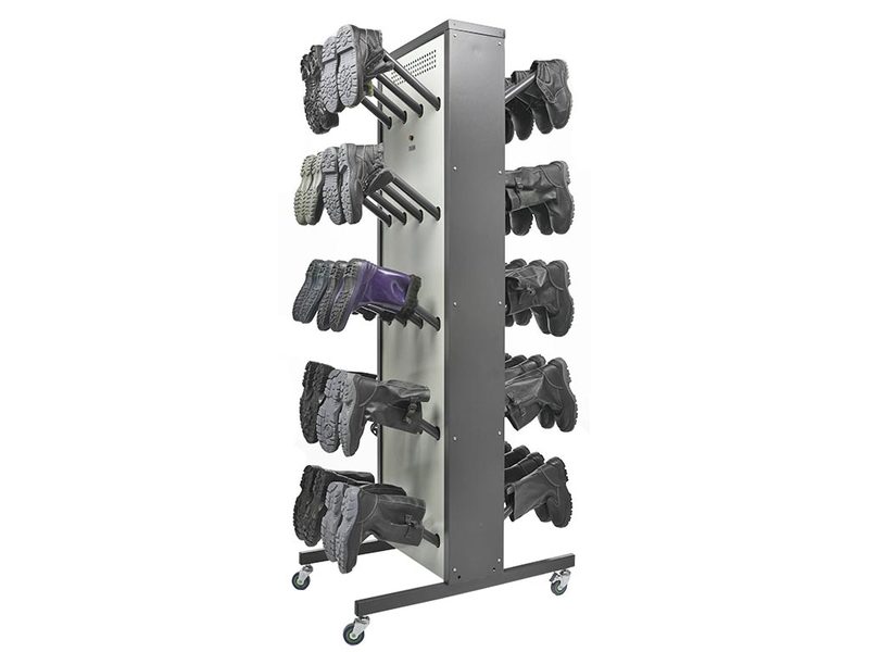 Принцип работы заключается в нагнетании теплого воздуха внутрь обуви через патрубки. Влажная обувь навешивается на расположенные на корпусе стойки кронштейны, через которые подается теплый воздух. Таким образом, конвекция воздуха происходит непосредственно во внутренней части ботинка, что существенно ускоряет процесс сушки. Каждый патрубок для обуви снабжен инерционным клапаном, перекрывает подачу воздуха, если ботинок не одет.